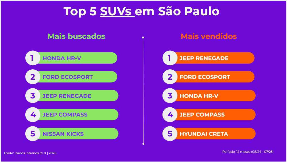 O HR-V está no topo do ranking dos mais procurados na capital paulista, seguido pelo Ford EcoSport, em segundo lugar, e o Jeep Renegade, em terceiro.
