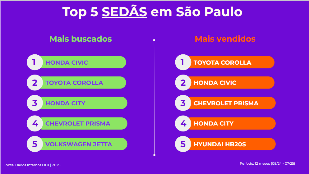 O Corolla é o sedã mais comercializado por meio da plataforma em São Paulo. O Honda Civic vem em segundo lugar e o Chevrolet Prisma em terceiro.