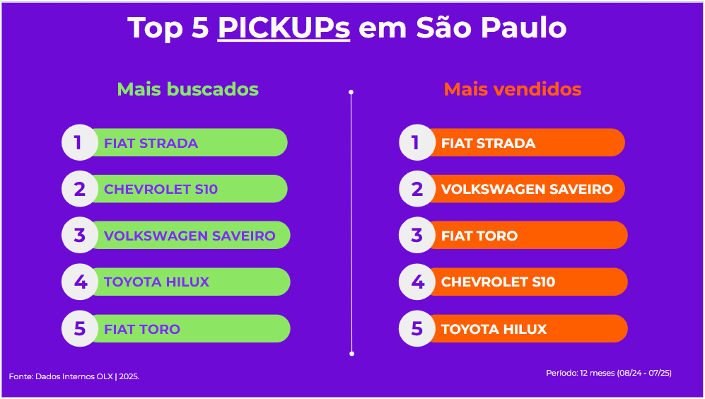 No caso das picapes, o levantamento do Data OLX Autos aponta a Fiat Strada como a mais comercializada em São Paulo. A Volkswagen Saveiro vem na segunda posição, seguida pela Fiat Toro, na terceira.