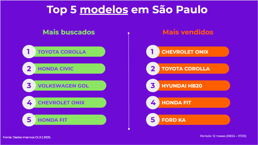 O Corolla é o mais procurado em São Paulo, seguido pelo Honda Civic, em segundo lugar, e o Volkswagen Gol, em terceiro.