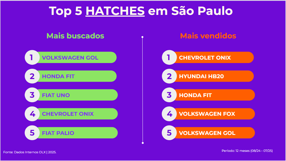 O Data OLX Autos traz indicadores dos TOP 5 modelos de destaque por carroceria. Na categoria hatch, o Onix lidera o ranking dos mais vendidos. O HB20 ocupa a segunda posição e o Honda Fit a terceira.