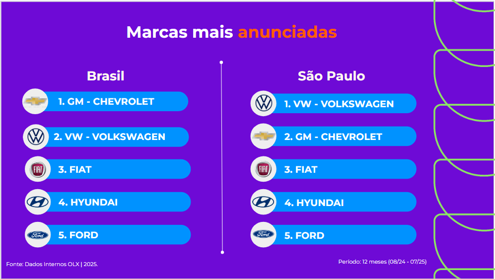 Após a Volkswagen, a Chevrolet é a segunda fabricante automotiva com modelos mais anunciados na plataforma na cidade de São Paulo. Em terceiro lugar, vem a Fiat.