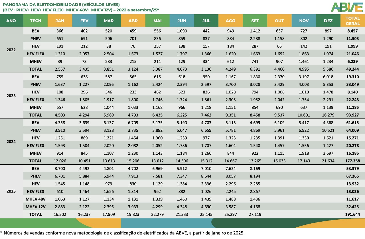 Os BEV 100% elétricos repetiram o desempenho robusto dos últimos meses e em setembro registraram vendas de 8.169 unidades, ficando também com 38% das vendas de eletrificados no mês. Sobre agosto (7.624), o crescimento dos BEV foi de 7%. E sobre setembro de 2024 (4.699), de expressivos 74%.