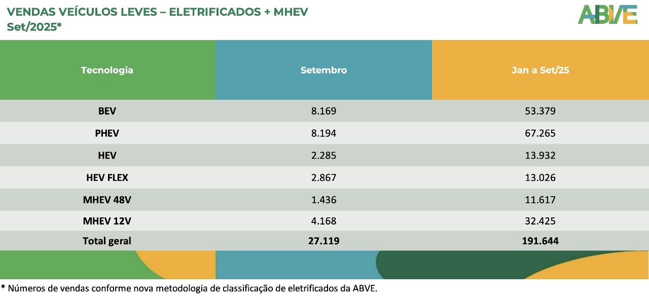 Veículos leves eletrificados por tecnologia no Brasil em setembro de 2025: