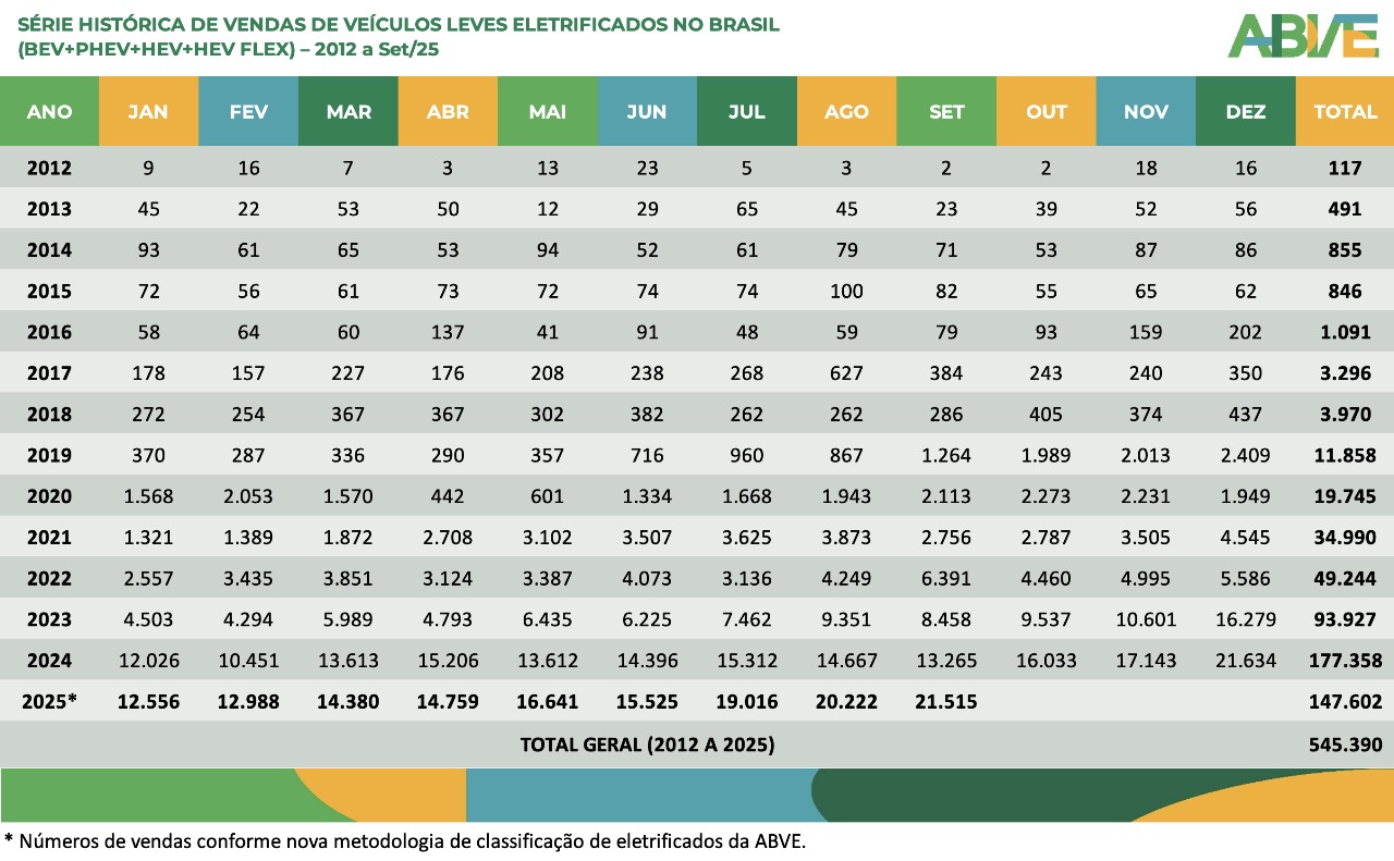 Num mês de novo recorde de vendas de veículos leves eletrificados em 2025, com 21.515 emplacamentos, o destaque ficou para os comerciais leves elétricos, que tiveram um crescimento expressivo de 51% de janeiro a setembro, em comparação com o mesmo período de 2024.