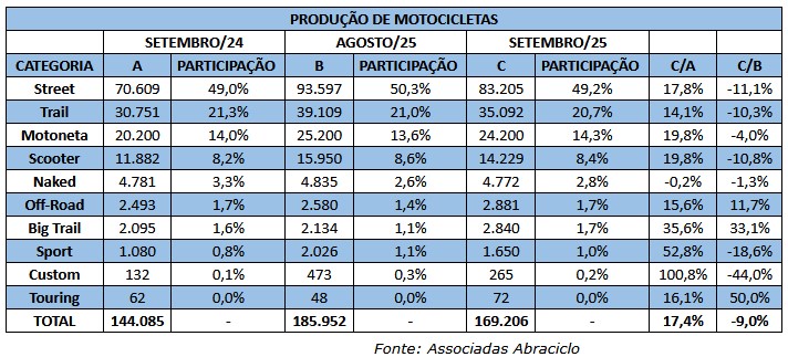 No acumulado do ano, a categoria Street liderou a produção, com 757.243 unidades, o que representa 50,6% do total fabricado. Em segundo lugar ficou a Trail, com 313.065 motocicletas (20,9%), seguida pela Motoneta, com 204.022 unidades (13,6%).