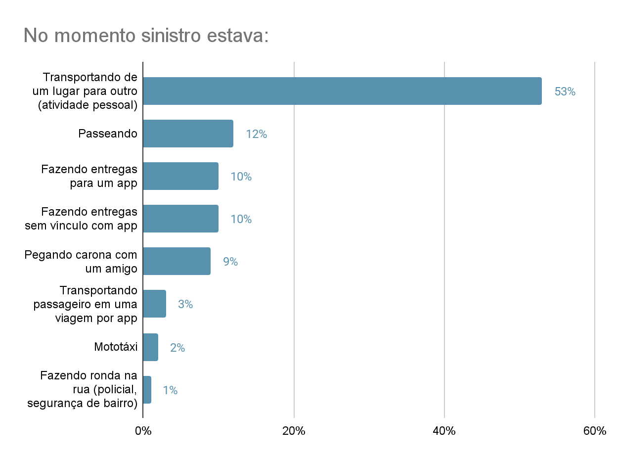A pesquisa se aprofundou sobre pontos específicos dos deslocamentos e do momento da ocorrência, tanto em relação à infraestrutura do local do sinistro, quanto ao uso da motocicleta. Cerca de 74% das vítimas estavam, no momento do sinistro, apenas se deslocando de um local para outro para atividades pessoais, passeando ou pegando carona com um amigo, sem relação com atividades comerciais ou serviços prestados na moto.