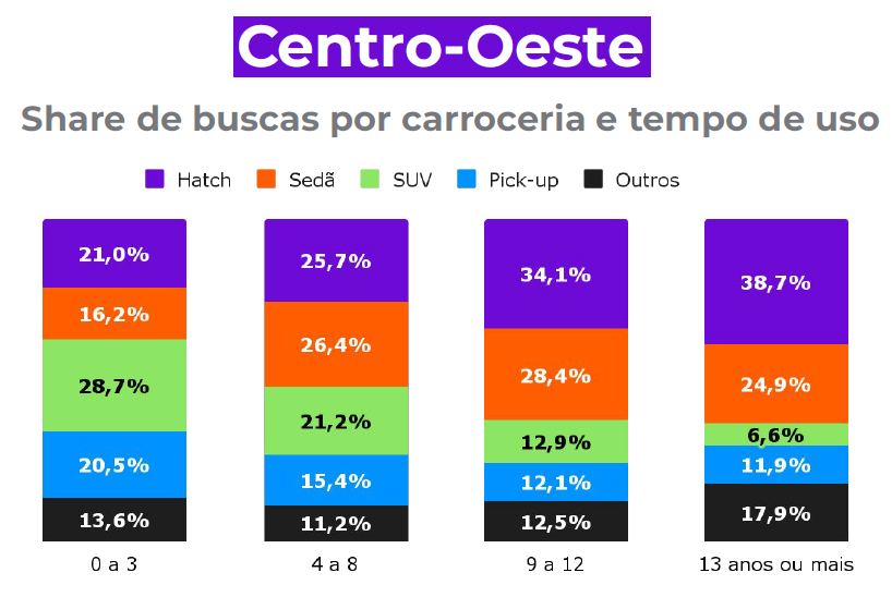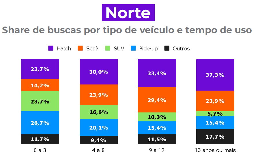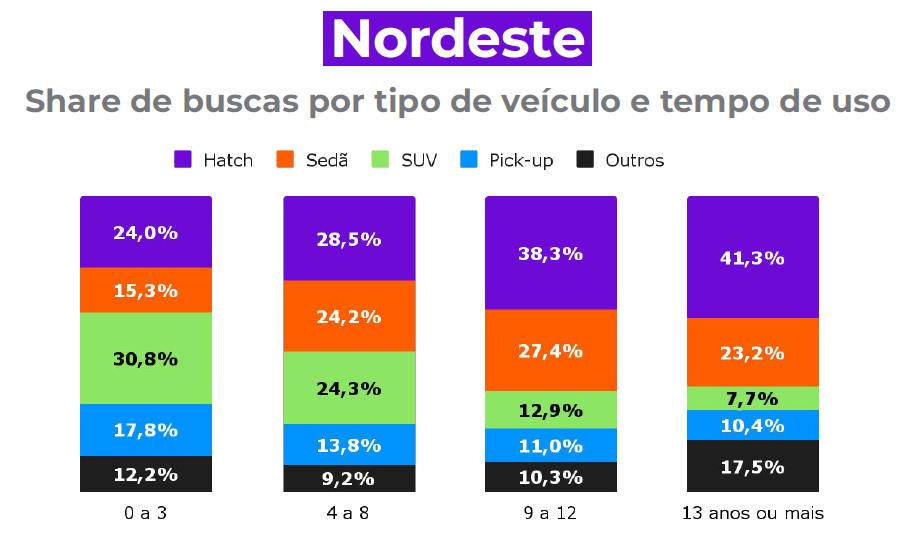 Em relação aos usuários do Nordeste, o Chevrolet Onix 2020 é o mais procurado, com 8,2% de share. A Fiat é a marca favorita, com 27,2%. Os hatches representam 41,3% de participação na procura dentre os carros de 13 anos ou mais.
