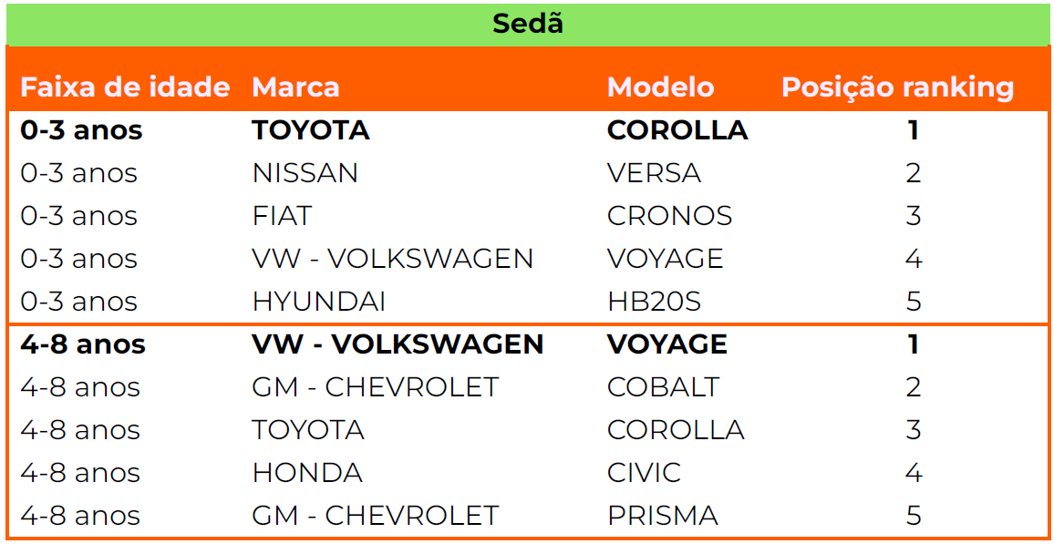 O Volkswagen Voyage lidera em tempo de venda dentre os sedãs com idade de 4-8 anos.