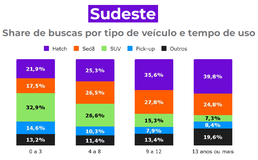 No Sudeste, o Honda HR-V 2016 foi o carro mais procurado no período, com 9,3% de participação. A marca Volkswagen é a mais procurada na região, com 28,5% de share. Os hatches somam 39,8% na faixa dos carros com mais de 13 anos.