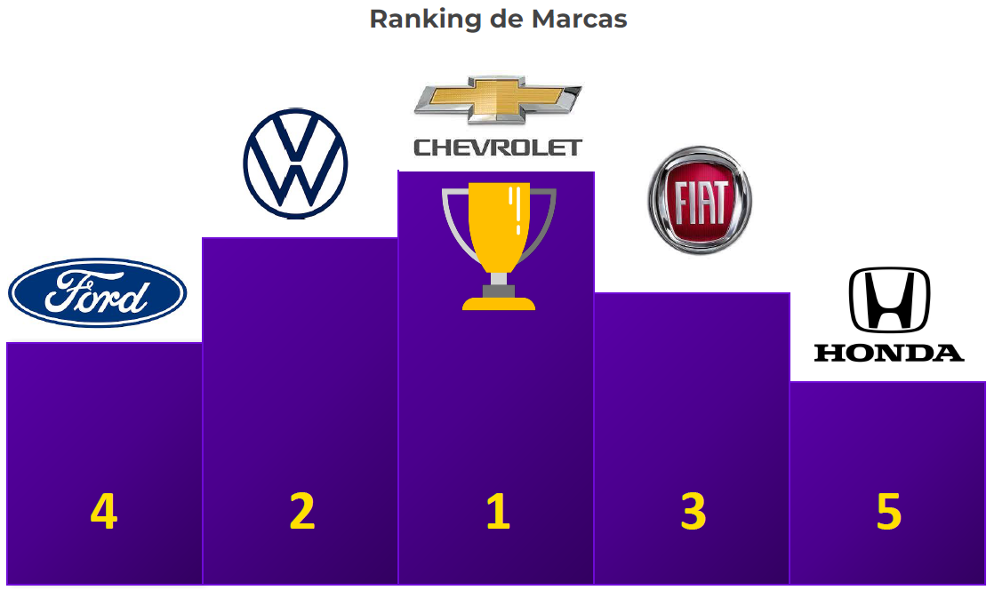 A Chevrolet é a fabricante com mais comercializações de automóveis na plataforma entre janeiro e outubro deste ano, seguida pela Volkswagen, na segunda posição, e a Fiat, na terceira.