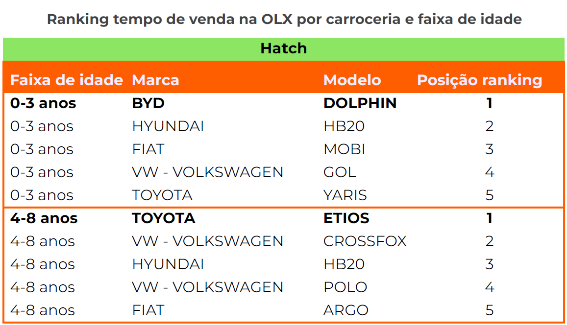 Dezembro de 2025 – O BYD Dolphin é o automóvel que registrou o melhor desempenho em liquidez nas vendas por meio da OLX entre janeiro e outubro, dentre os hatches com idade de 0-3 anos. É o que mostra a nova edição do Radar Autos, relatório elaborado pelo Data OLX Autos, fonte de inteligência automotiva do Grupo OLX, que traz indicadores de consumo e de mercado. No caso dos SUVs seminovos, outro modelo chinês está à frente: o CAOA Chery Tiggo 5X. Já dentre os sedãs, o Corolla, da japonesa Toyota, ocupa a primeira posição.