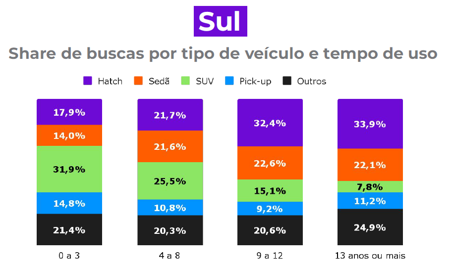 No Sul do país, o Honda HR-V 2016 é o automóvel mais procurado na região, com 7,5%. A Volkswagen é a marca mais procurada, com 33,3%. Os hatches representam 33,9% das pesquisas na plataforma dentre os modelos com 13 anos ou mais.