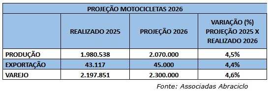 A Associação Brasileira dos Fabricantes de Motocicletas, Ciclomotores, Motonetas, Bicicletas e Similares - Abraciclo projeta mais um ano de crescimento para o setor de duas rodas. As fábricas instaladas no Polo Industrial de Manaus (PIM) deverão produzir 2.070.000 motocicletas em 2026, volume 4,5% superior às 1.980.538 unidades fabricadas em 2025.