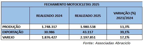 No mesmo período, as associadas da Abraciclo embarcaram 3.495 motocicletas para o exterior, alta de 38,8% em relação a dezembro de 2024 e 23,4% menor que em novembro