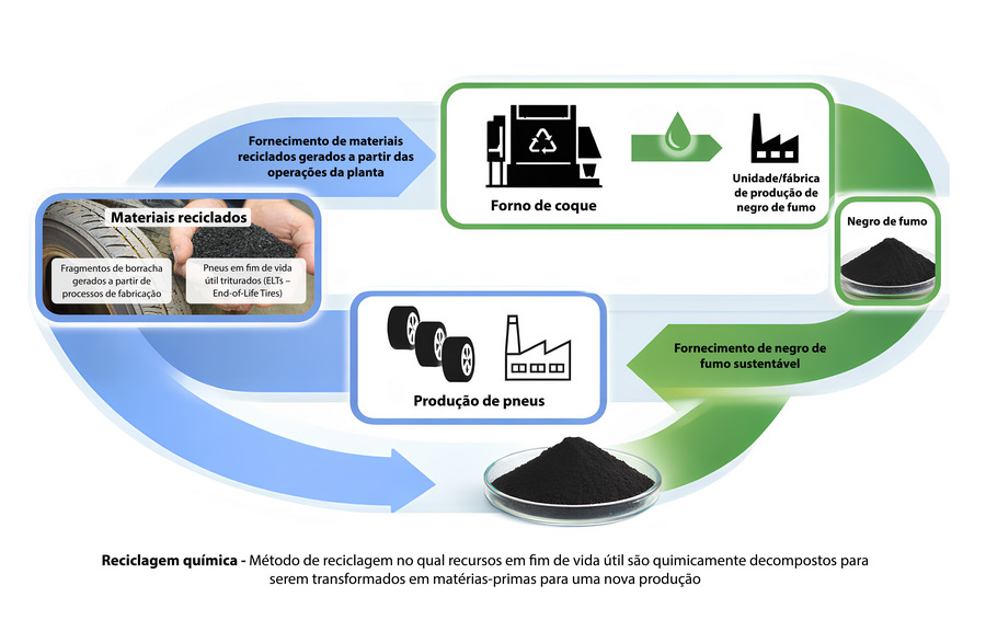 O negro de fumo sustentável é fabricado a partir de aparas de borracha geradas nos processos de produção de pneus e de ELTs triturados, que passam por um processo conhecido como reciclagem química. O desenvolvimento dessa solução vem sendo conduzido em um projeto conjunto com a Mitsubishi Chemical Corporation desde janeiro de 2025.