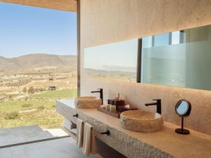 No Banyan Tree Veya Valle de Guadalupe, o conceito de bem-estar aparece em todos os detalhes da hospedagem. Os banheiros se destacam pelas banheiras posicionadas de frente para a paisagem árida do vale, criando um contraste entre o design sofisticado do ambiente e o deserto ao redor. O momento do banho acaba se tornando uma experiência contemplativa, ideal para relaxar depois de um dia explorando vinícolas e restaurantes da região.