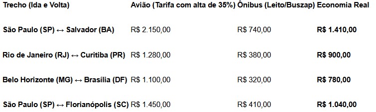 O levantamento simulou os valores para passagens de ida e volta, comparando o aéreo (com a projeção de alta de 35%) e o rodoviário (leito/semi-leito). Em alguns trechos, a economia paga toda a hospedagem do viajante.