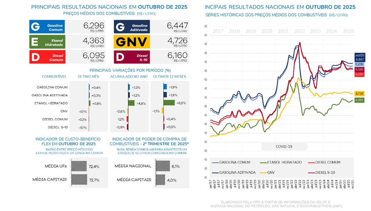 Considerando os dados de outubro de 2025, o preço médio do litro do etanol correspondeu a 72,4% do valor apurado para a gasolina comum na média das unidades da federação, e a 72,7% na média das capitais. Ao se manterem acima do patamar de referência de 70%, esses índices indicam que a gasolina comum segue sendo a opção mais vantajosa na maior parte do país — especialmente em postos do Nordeste e Norte.