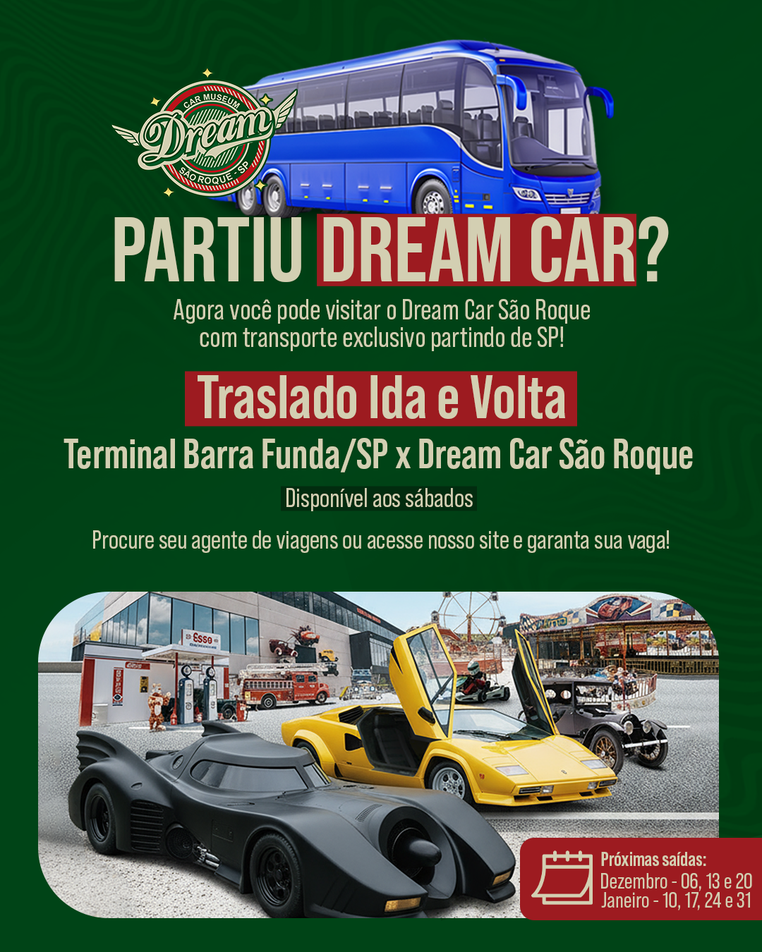Uma novidade vai proporcionar maior conforto e tranquilidade a quem desejar conhecer ou visitar novamente o Parque Dream Car de São Roque. Todos os sábados deste mês de dezembro e janeiro de 2026, um ônibus fará a ligação direta entre a capital paulista e o centro de entretenimento. As saídas ocorrem às 8h30 da Estação Metrô Barra Funda (Rua Tagipuru, 795, em frente ao espaço Unimed), enquanto o retorno de São Roque está previsto para as 16 horas. A viagem inaugural ocorrerá no dia 6 de dezembro.