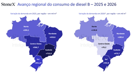 Segundo o especialista de Inteligência de Mercado, Bruno Cordeiro, a revisão está diretamente ligada ao aumento das projeções agrícolas. “A elevação das estimativas de safra, especialmente de soja, sustenta um maior fluxo de transporte de grãos no país e, consequentemente, um consumo mais elevado de diesel B em 2026”, realça.