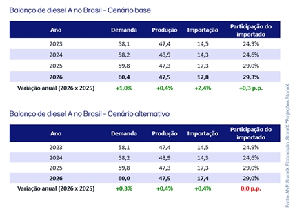 No cenário base, a demanda por diesel A deve atingir 60,4 milhões de m³ (+1%), exigindo 17,8 milhões de m³ de importações — o maior volume da série histórica.