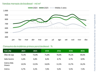 O uso de óleo de soja superou 6,8 milhões de toneladas (+9,3%), enquanto o share médio da matéria-prima subiu para 73,4% no ano. “O crescimento da demanda por diesel B e a elevação da mistura para 15% a partir de agosto foram determinantes para o avanço do consumo”, conclui Isabela Garcia.
