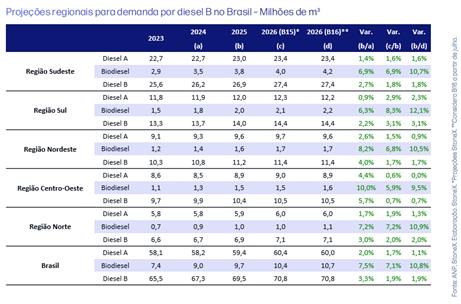 A consultoria também traçou dois cenários para o diesel A em 2026, considerando a manutenção do B15 ao longo do ano (cenário base) ou a adoção do B16 a partir de julho (cenário alternativo).