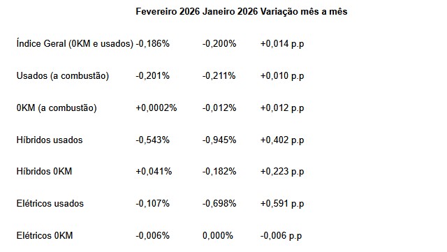 Movimento semelhante registrou a categoria de híbridos 0KM, com índice de +0,041%, contra –0,182% em janeiro. Já os híbridos usados, embora ainda em território negativo com índice de -0,543%, apresentaram melhora em relação aos -0,945% do mês anterior, reduzindo a desvalorização em +0,402 ponto percentual.